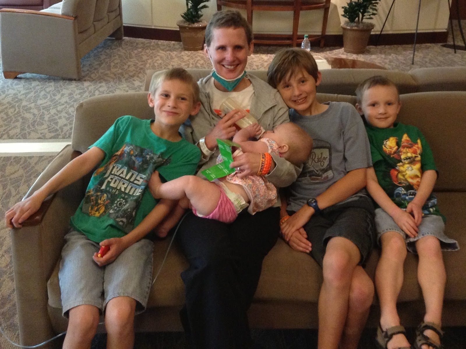 She's been in the hospital a week - undergone 13.2 gray of radiation treatments and one chemo treatment of etoposide in order to effectively kill off her bone marrow (and leukemia) and make room for her new bone marrow, which she received today. It was kind of anti-climactic - the staff hooked her up to a little bag of what looks like tomato soup and it took about 15 minutes to enter her bloodstream. Now we just have to wait for it to engraft, which could take anywhere from two to four weeks. We'll know that is has engrafted once her blood levels start to increase from zero. She's not quite down to zero now, but she's getting close. This is because her old marrow is now ineffective, so in order to keep her up and running for the next couple of weeks, she'll need to receive multiple transfusions of blood and platelets. Unfortunately this means that she'll probably not be able to see the kids until she is released, but it also means we're getting closer to her being able to go home. And we've been blessed that the kids have been able to visit with her every day since she's been in the hospital.
